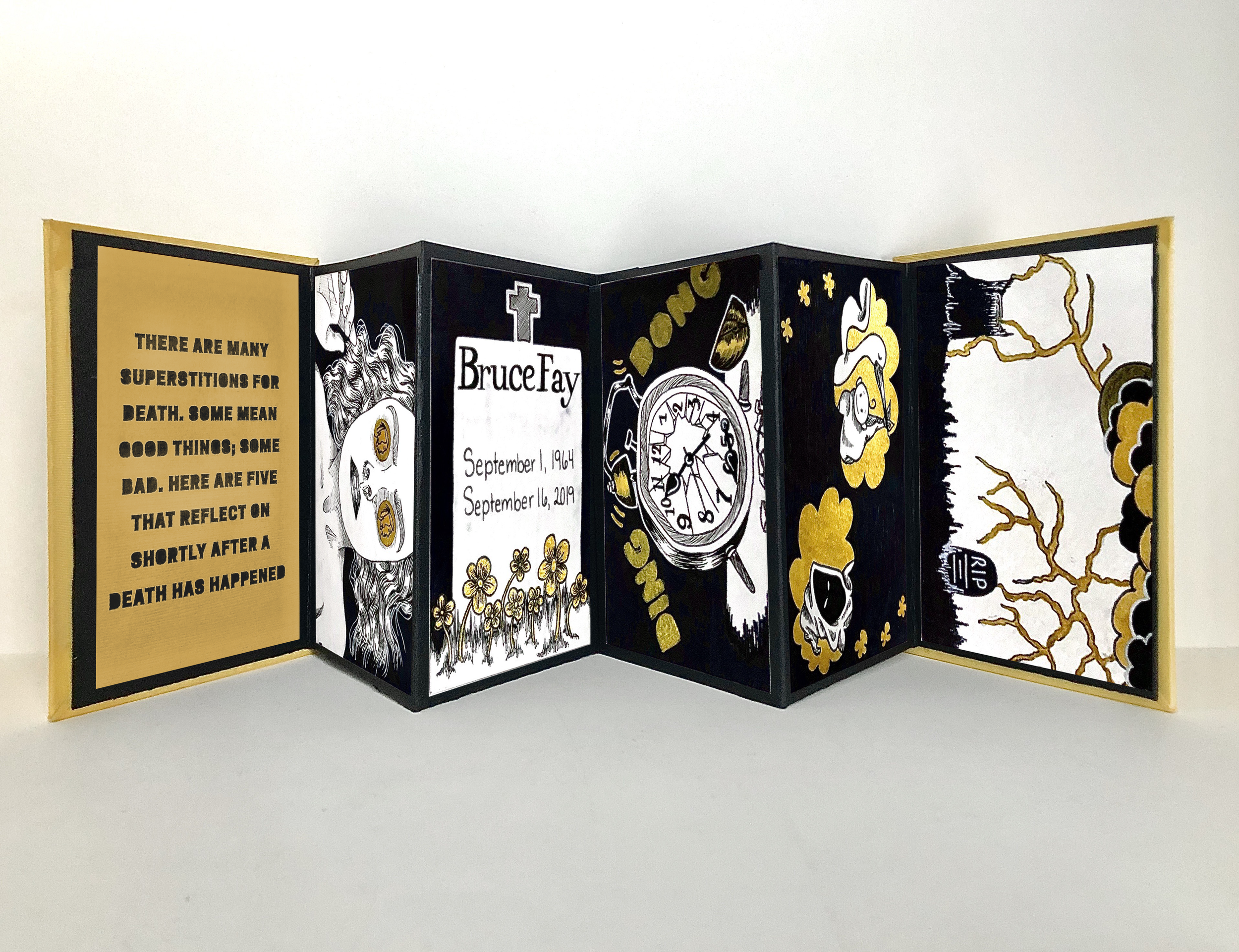 This project is one of my top three projects to have been given. We were given three overall topics to base the accordion on: superstitions, the five senses, or urban legends/old wives’ tales. Superstitions have always fascinated me, and death has always been a curious taboo subject for me, so I decided to marry the two subjects.